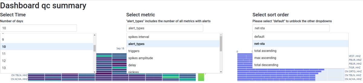 Drop-down menus included in the Dashboard: Left: the period in days. Center: parameter to analyze (metric). Right: Station sort order method.