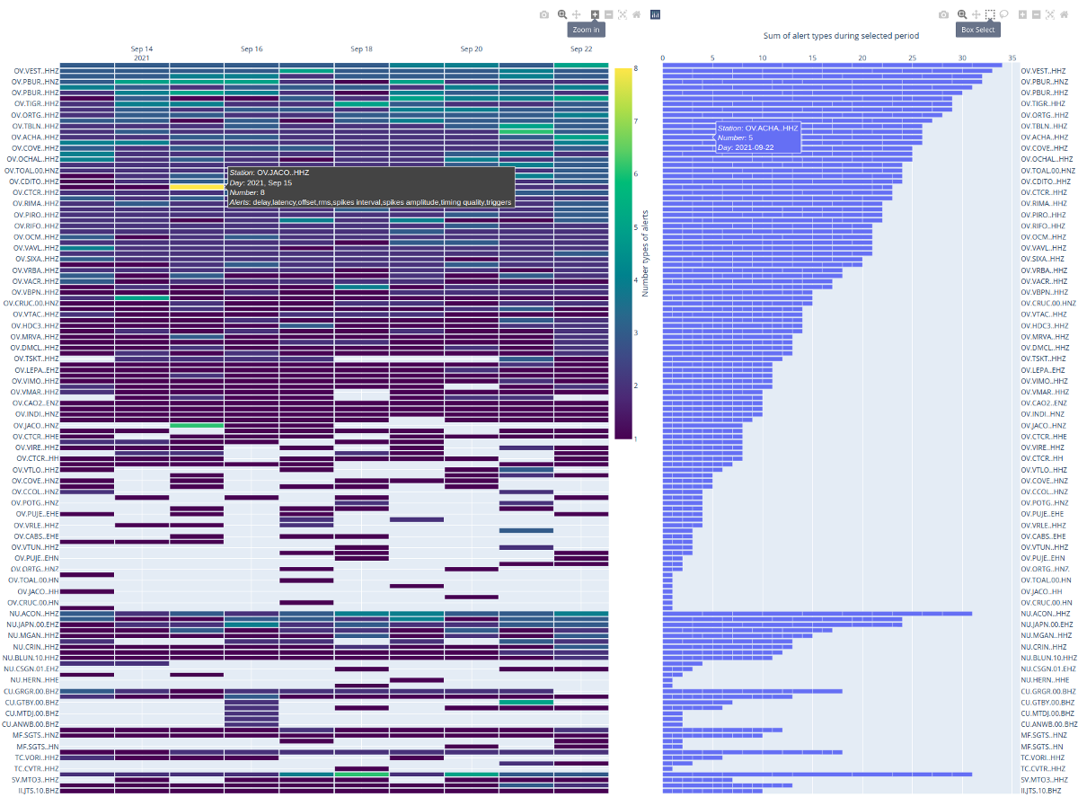 Hovering the pointer over any cell in the graph will show the information associated with this cell: station, number of alerts/types of alerts, and day (blue box in the Figure).