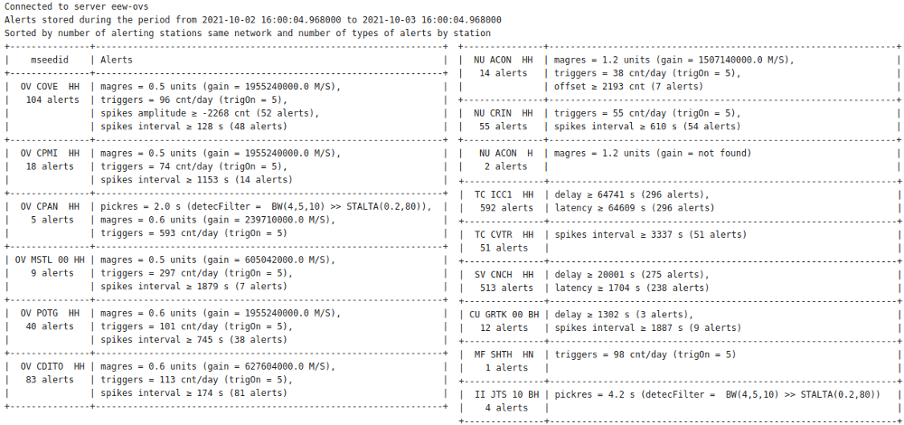 An email including all alerts collected from scqc and produced by scqcalert will be automatically sent to a customizable mailing list every reporting period (by default 24 hours). This email includes a table grouping the alerts for all the channels of each instrument. In the column `` mseedid ‘’, the name of the station is presented without including the component. The `` Alerts ‘’ column includes the parameter’s name, the worst value of the collected alerts, and additional information, which could be the number of alerts and/or relevant configuration values .
